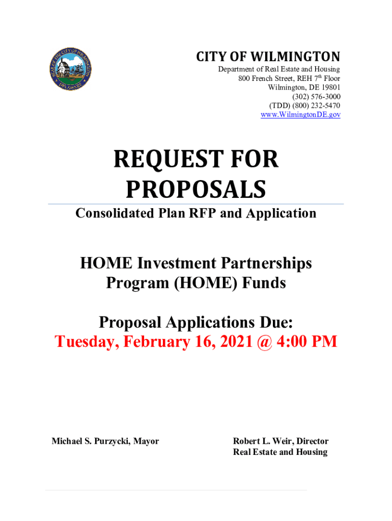 CITY OF WILMINGTONDepartment of Real Estate and Housing 800 French Street, RED 7th Floor Wilmington, DE 19801 (302) 5763000 (TDD) (800) 2325470 www.WilmingtonDE.govREQUEST FOR PROPOSALSConsolidated