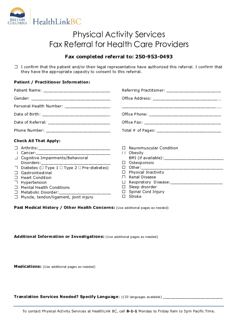 Physical Activity Services Fax Referral for Health Care Providers Fax completed referral to: 2509530493 I confirm that the patient and/or their legal representative have authorized this referral.