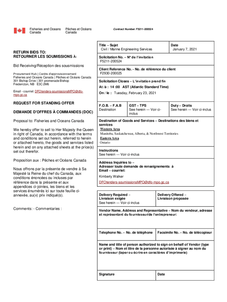 Contract Number: F5211200524RETURN BIDS TO: RETURNER LES COMMISSIONS :Title Suet Civil / Marine Engineering ServicesDate January 7, 2021Solicitation No. N de invitation F5211200524Bid Receiving/Reception