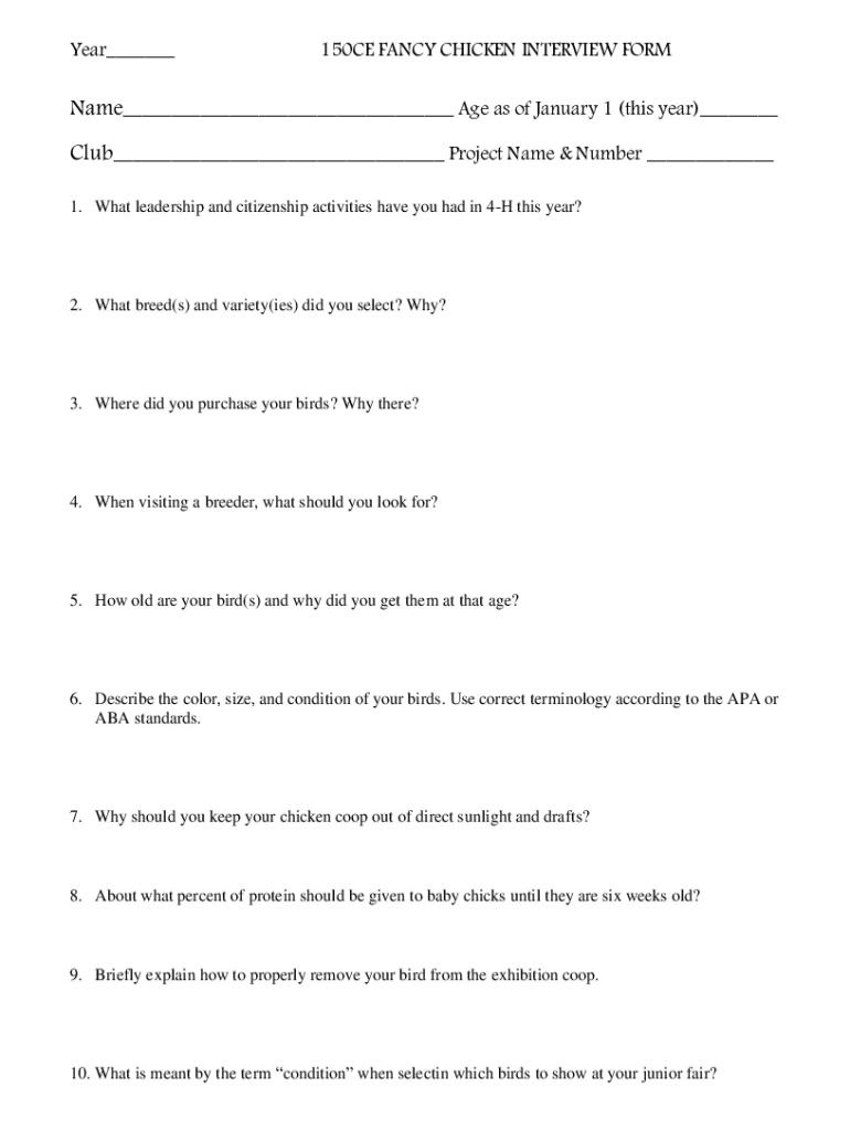 Year 150CE FANCY CHICKEN INTERVIEW Forename Age as of January 1 (this year) Club Project Name & Number 1. What leadership and citizenship activities have you had in 4H this year?2. What breed(s) and