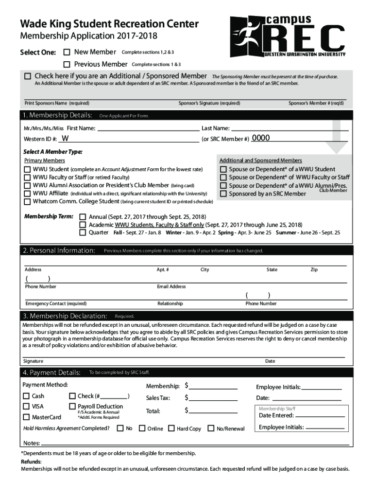 Wade King Student Recreation Center Membership Application 20172018 New Member Select One:Complete sections 1,2 & 3Previous MemberComplete sections 1 & 3Check here if you are an Additional / Sponsored