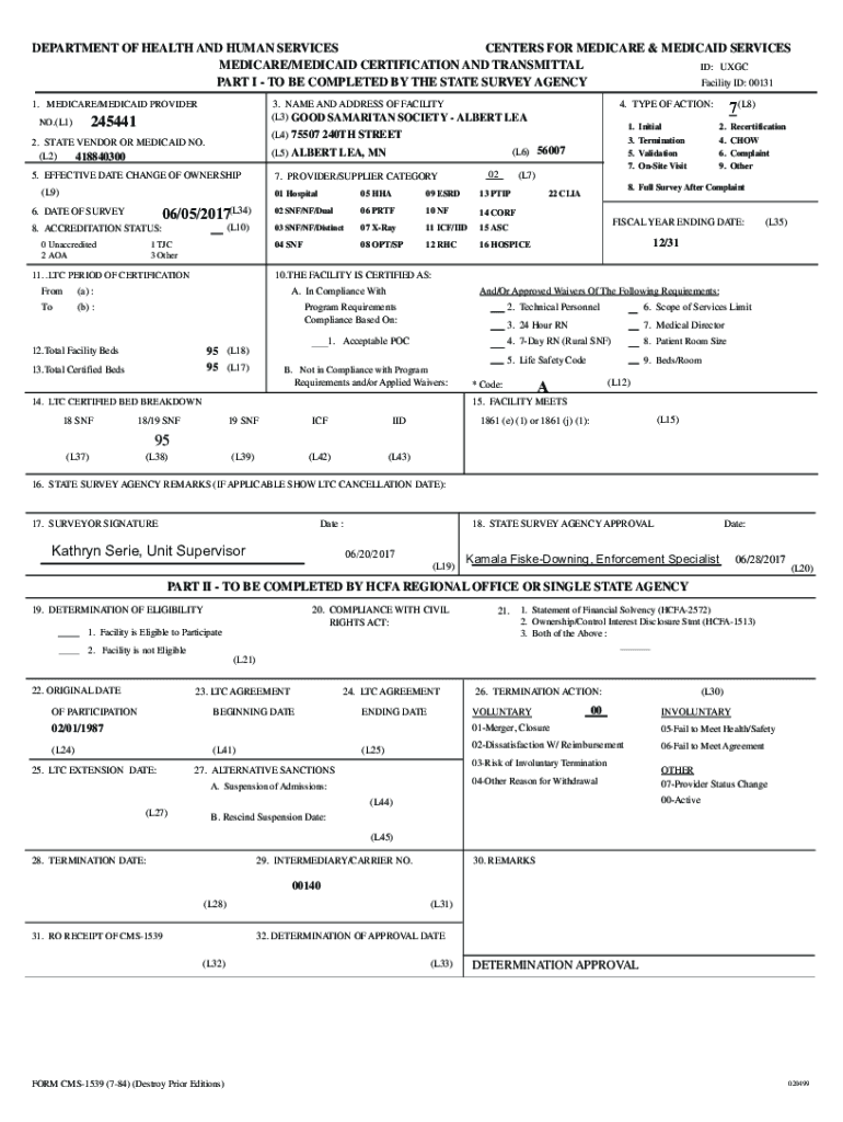 DEPARTMENT OF HEALTH AND HUMAN SERVICES CENTERS FOR MEDICARE & MEDICAID SERVICES MEDICARE/MEDICAID CERTIFICATION AND TRANSMITTAL ID: UGC PART I TO BE COMPLETED BY THE STATE SURVEY AGENCY Facility