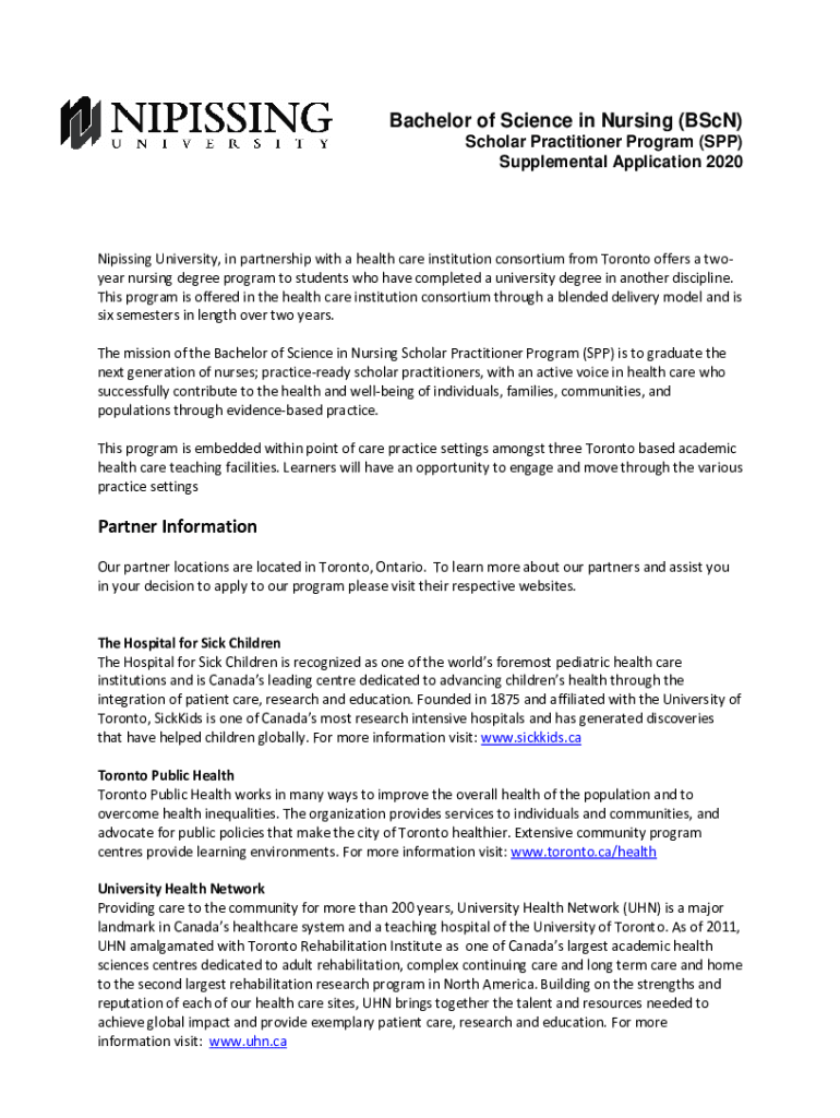 Supplemental Application 2020Nipissing University, in partnership with a health care institution consortium from Toronto offers