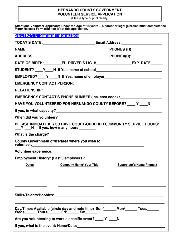HERNANDO COUNTY GOVERNMENT VOLUNTEER SERVICE APPLICATION (Please type or print clearly) Attention: Volunteer Applicants Under the Age of 18 years A parent or legal guardian must complete the Minor