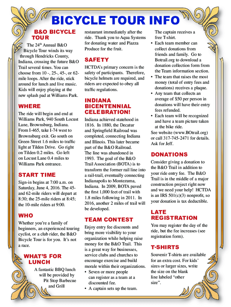 BICYCLE TOUR INFORM BICYCLE Fourth 24th Annual B&O Bicycle Tour winds its way through Hendricks County, Indiana, crossing the future B&O Trail several times. You can choose from 10, 25, 45, or 62mile