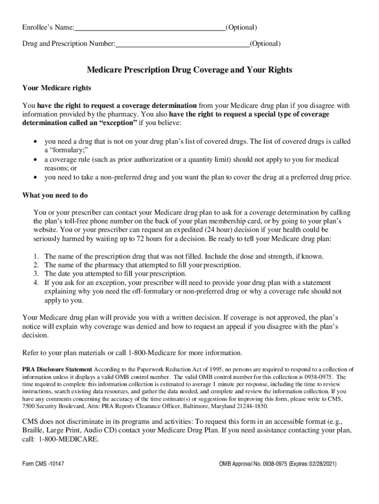Enrolled Name:(Optional)Drug and Prescription Number:(Optional)Medicare Prescription Drug Coverage and Your Rights Your Medicare rights You have the right to request a coverage determination from