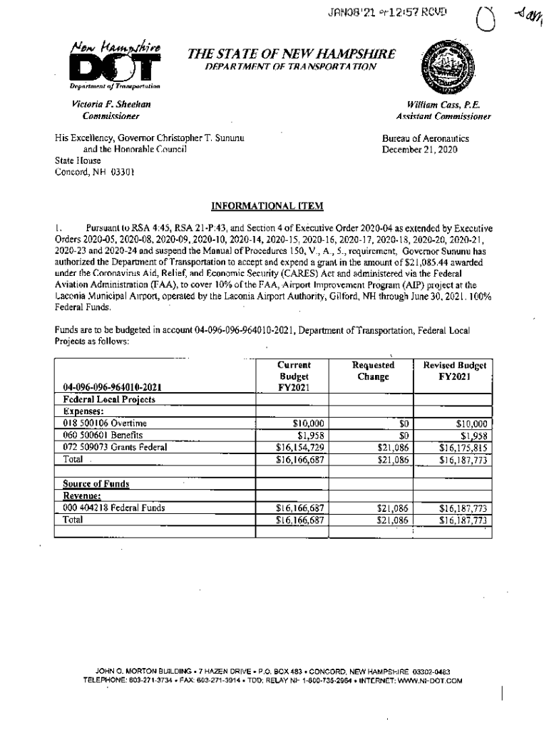 JP)N03 '21 rl257 RCD/ en/DCt0THSTA TE OF NEW HAMPSHIRE DEPARTMENT OF TRANSPORT TIONDnpnrtmKtU ofTmntparlation Victoria F. SheehanWilliam Class, P.E. CommissionerAssistant Commissioners Excellency,