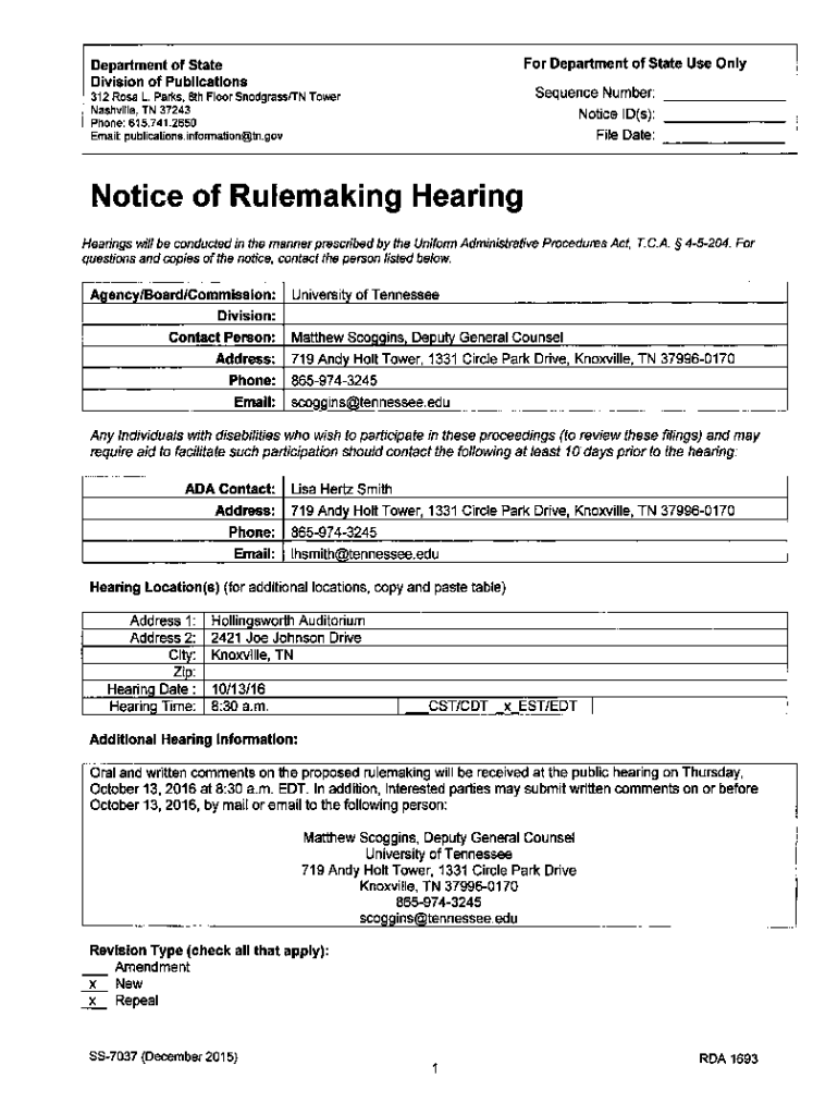 For Department of State Use OnlyDepartment of State Division of PublicationsSequence Number: Notice ID(s): File Date:312 Rosa L. Parks, 8th Floor Snodgrass/TN Tower Nashville, TN 37243 Phone: 615.741.2650