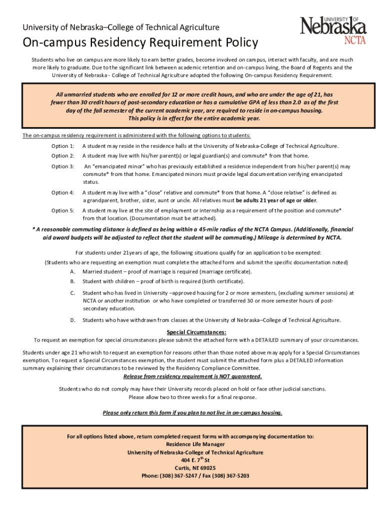 University of NebraskaCollege of Technical AgricultureOncampus Residency Requirement Policy Students who live on campus are more likely to earn better grades, become involved on campus, interact with