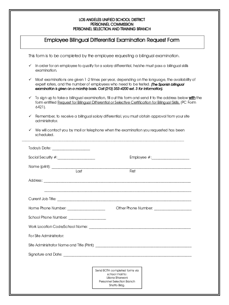 Employees who wish to qualify for the bilingual differential pay must file the employee bilingual differential examination. This generally applies to employees in positions or roles that require bilingual skills.