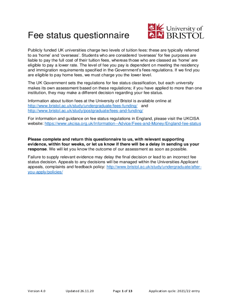 Fee status questionnaire
