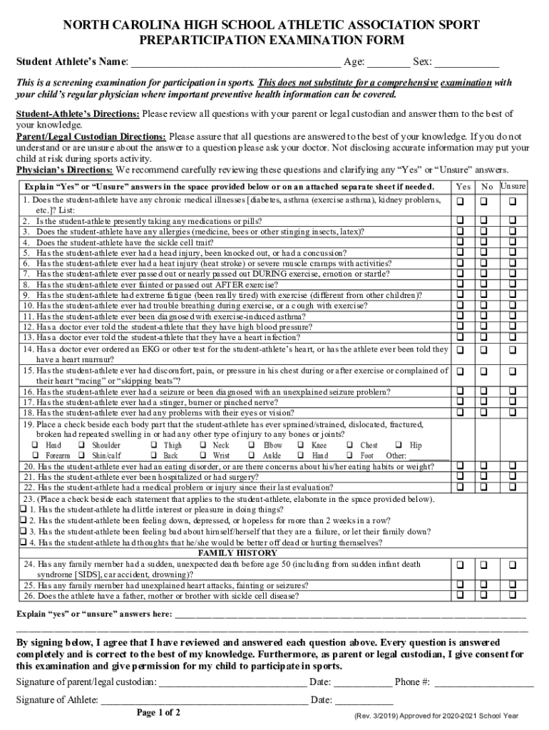 NORTH CAROLINA HIGH SCHOOL ATHLETIC ASSOCIATION SPORT PARTICIPATION EXAMINATION FORM Student Athletes Name: Age: Sex: This is a screening examination for participation in sports. This does not substitute