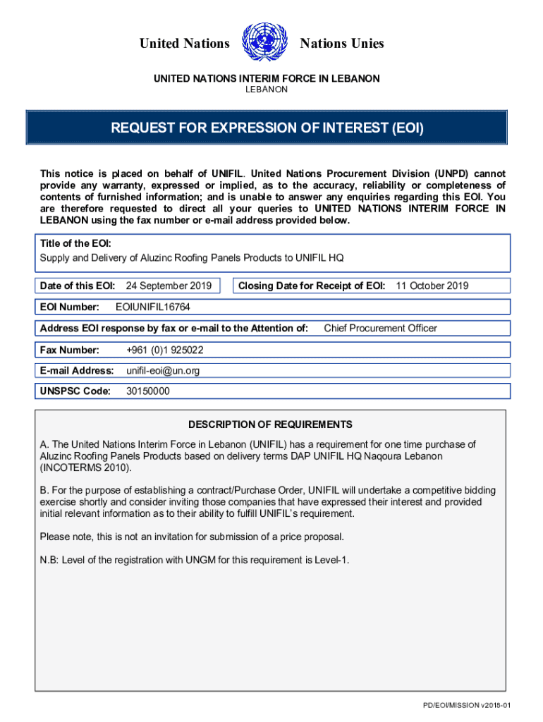 This notice is placed on behalf of UNIFIL. United Nations Procurement Division (NPD)
