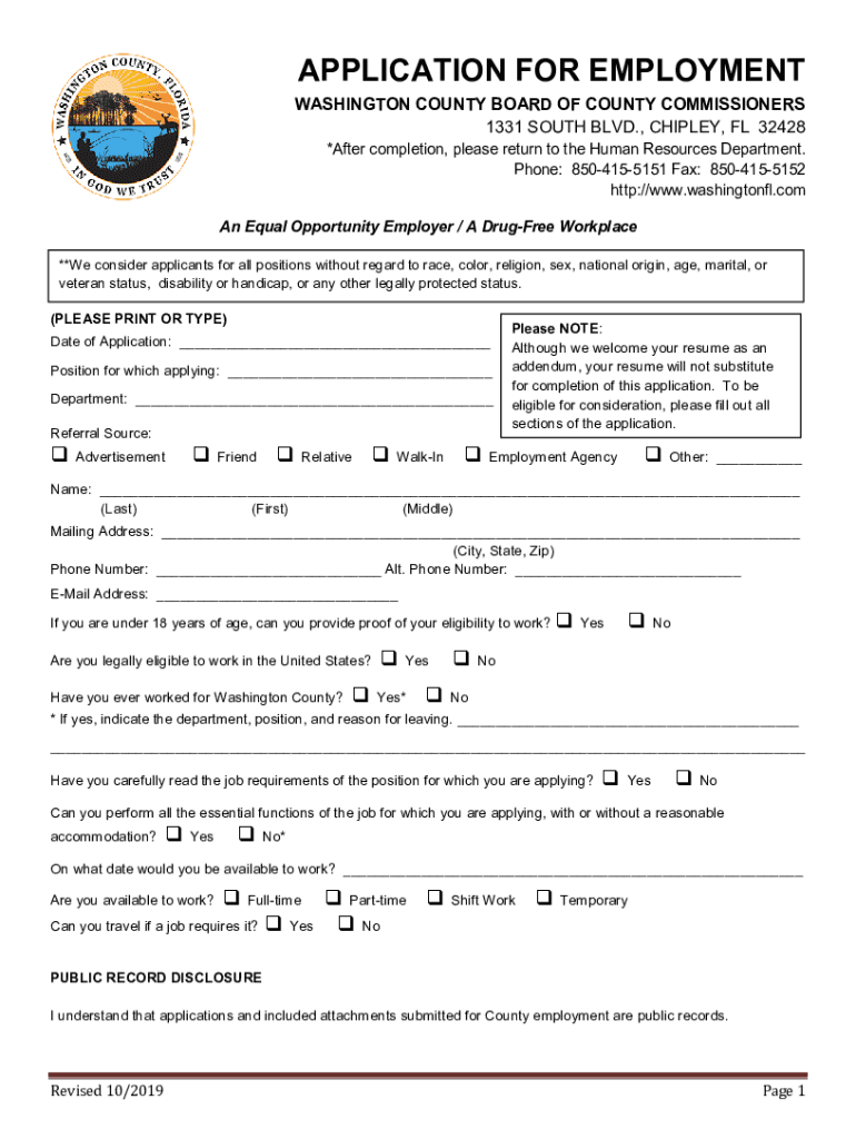 APPLICATION FOR EMPLOYMENTWASHINGTON COUNTY BOARD OF COUNTY COMMISSIONERS