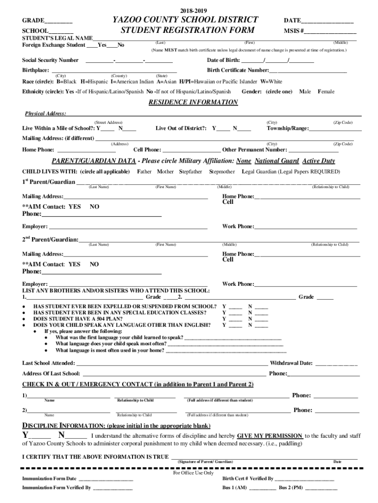 20182019YAZOO COUNTY SCHOOL DISTRICT STUDENT REGISTRATION FORBADE SCHOOL DATE ISIS # STUDENTS LEGAL NAME (Last) (First) (Middle) Foreign Exchange Student Yes No (Name MUST match birth certificate