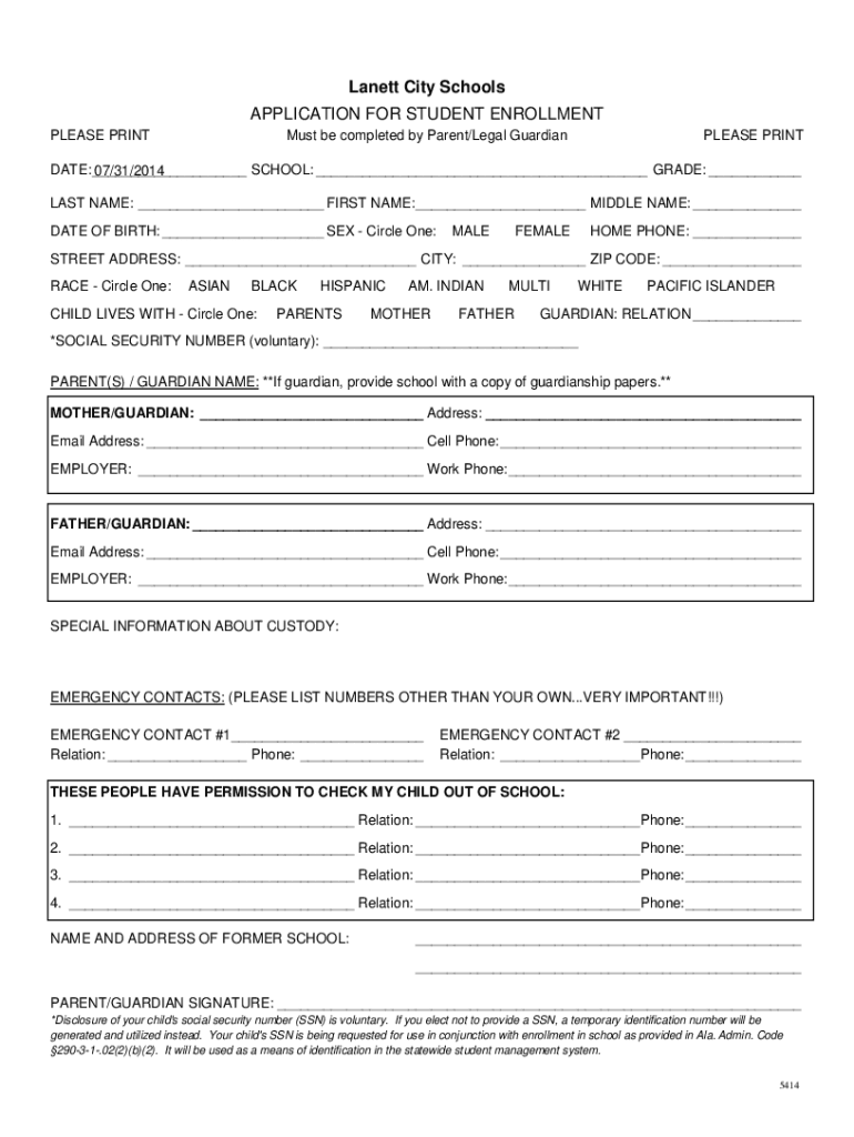 Planet City Schools APPLICATION FOR STUDENT ENROLLMENT PLEASE Printout be completed by Parent/Legal GuardianPLEASE PRIVATE: SCHOOL: GRADE: 07/31/2014 LAST NAME: FIRST NAME: MIDDLE NAME: DATE OF BIRTH: