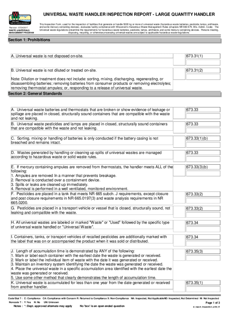 UNIVERSAL WASTE HANDLER INSPECTION REPORT LARGE QUANTITY HANDLER Revision: 07/24/2017 WASTE & MATERIALS MANAGEMENT Programs Inspection Form, used for the inspection of facilities that generate or
