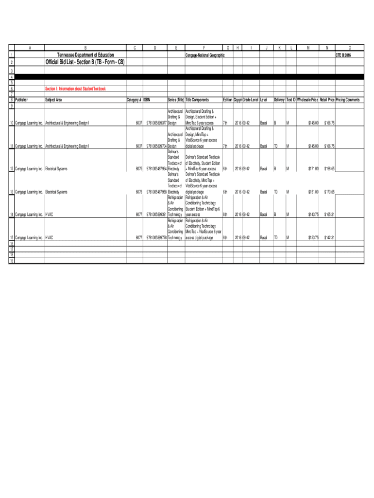 AB1Tennessee Department of Education2Official Bid List Section B (TB Form CB)3 4 5 6 7 8 Publisher 9Section I: Information about Student Textbook Subject Area10 Cengage Learning Inc. Architectural