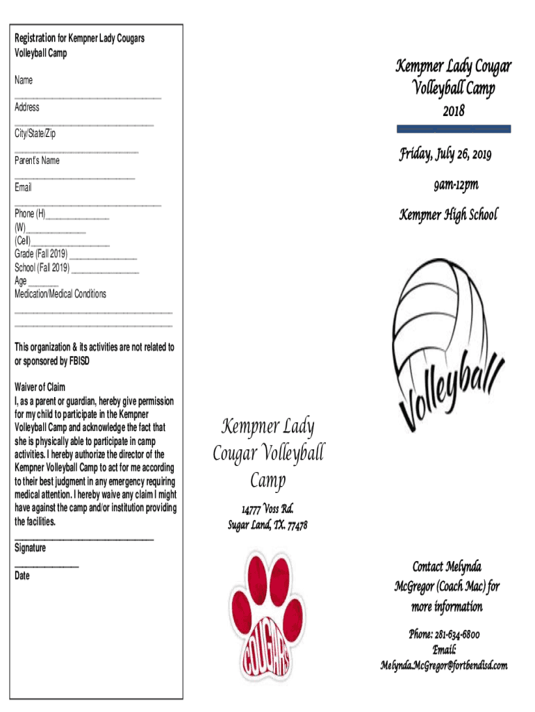 Registration for Keeper Lady Cougars Volleyball CampKempner Lady Cougar Volleyball Camp 2018Name Address City/State/Zip Parents Name Email Phone (H) (W) (Cell) Grade (Fall 2019) School (Fall 2019)