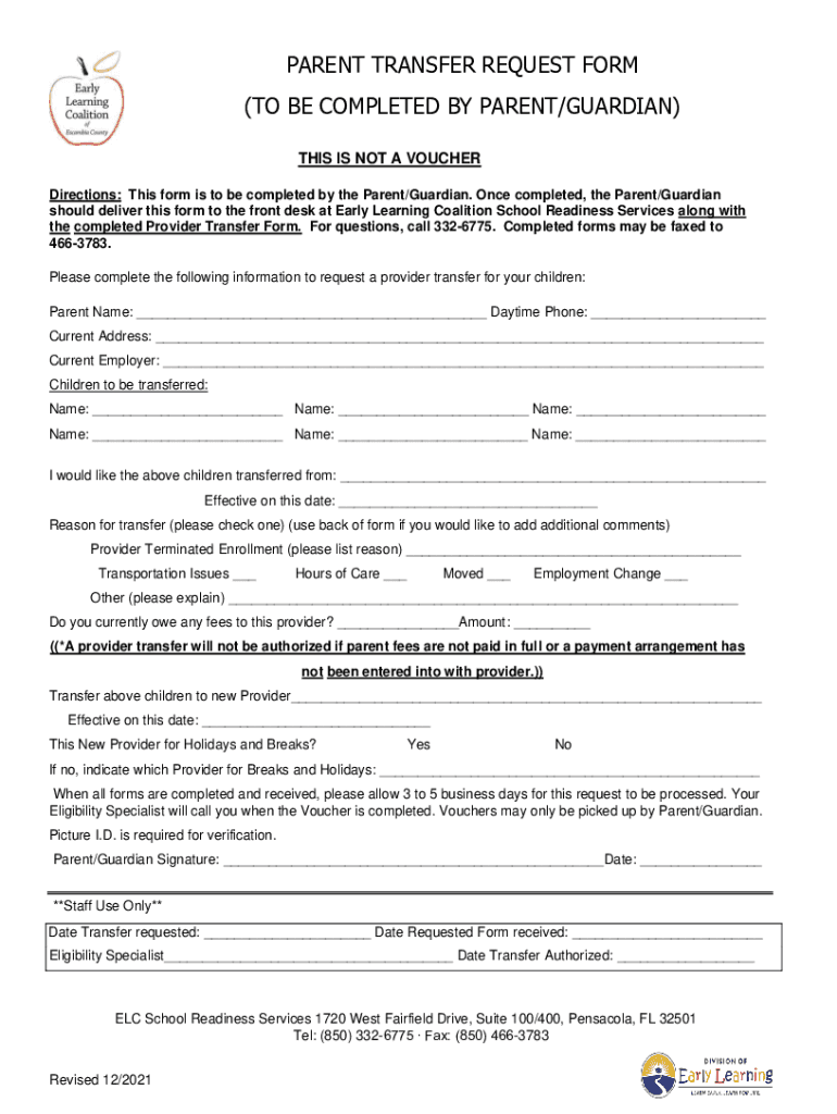 The Parent Transfer Request Form is intended for parents or guardians in Florida who need to request a transfer for their children enrolled in the Early Learning Coalition School Readiness Services program.