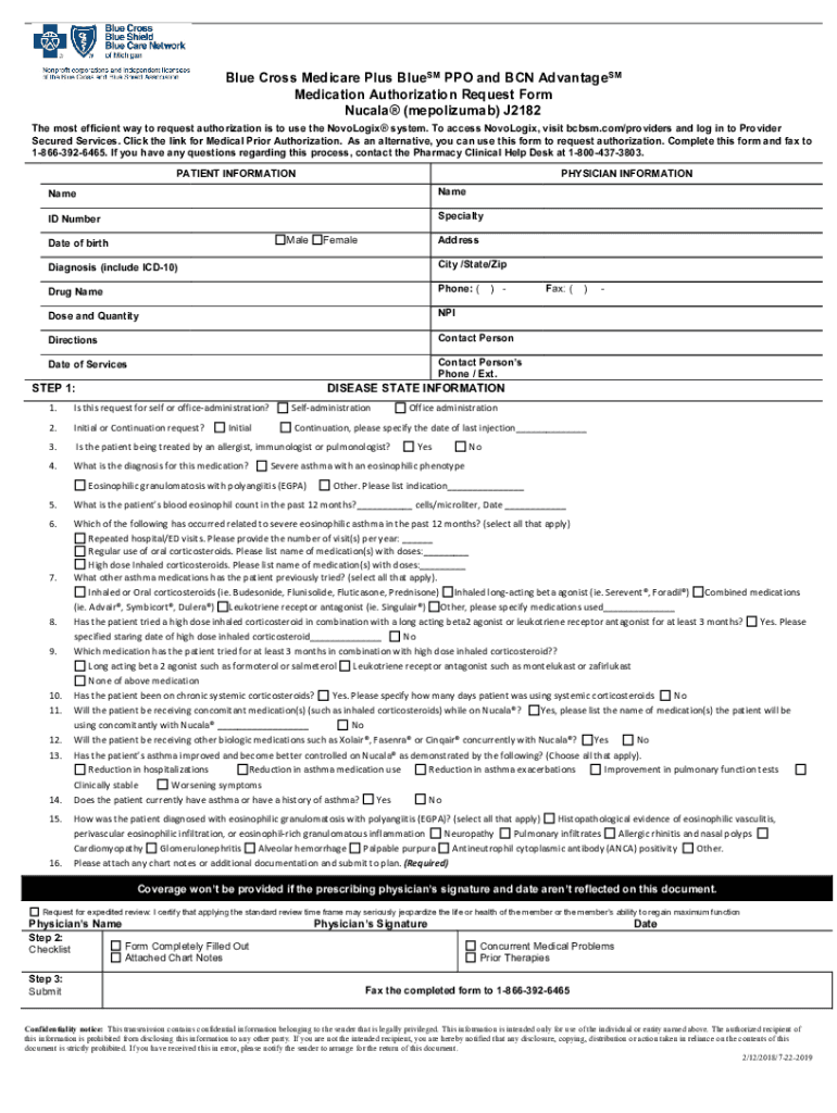 Blue Cross Medicare Plus Blues PPO and BCN Advantages Medication Authorization Request Form (mepolizumab) J2182 The most efficient way to request authorization is to use the Horologic system. To access