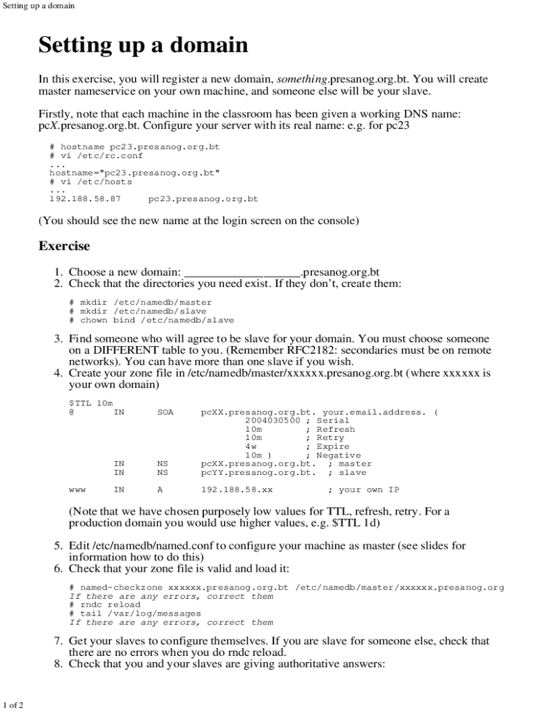 Setting up a domainSetting up a domain In this exercise, you will register a new domain, something.present.org.BT. You will create master name service on your own machine, and someone else will be