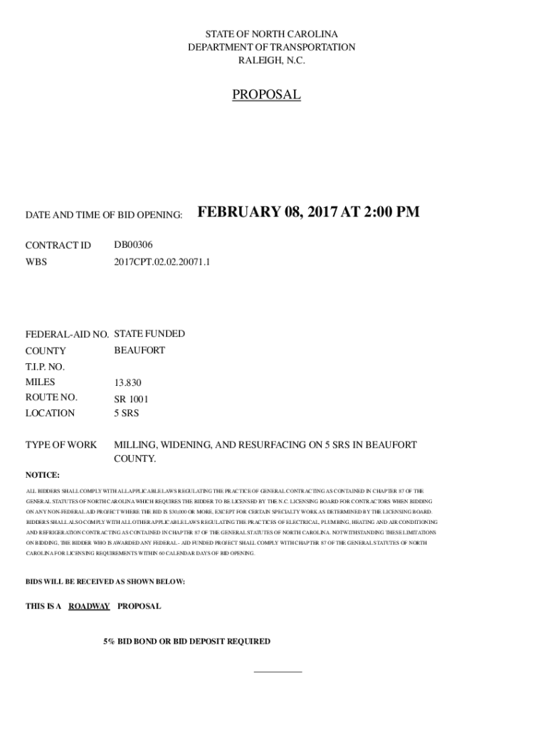 RALEIGH, N.C.PROPOSALDATE AND TIME OF BID OPENING:FEBRUARY 08, 2017, AT 2:00 CONTRACT IDDB00306WBS2017CPT.02.02.20071.1FEDERALAID NO. STATE FUNDED