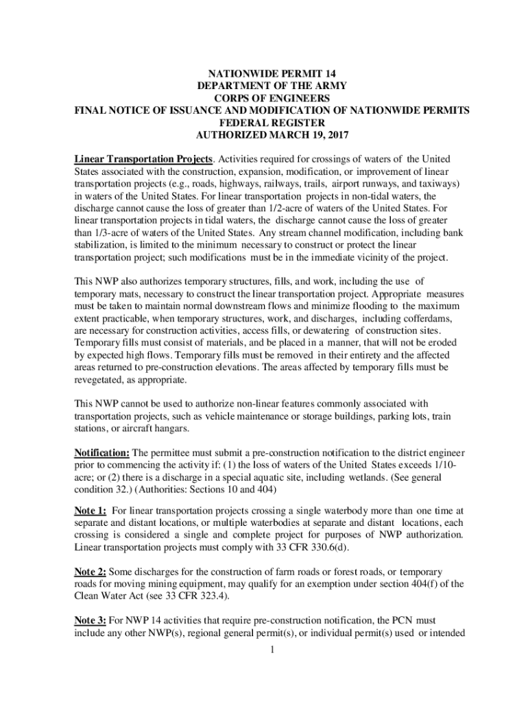 Get the free NATIONWIDE PERMIT 14 DEPARTMENT OF THE ARMY CORPS OF ...