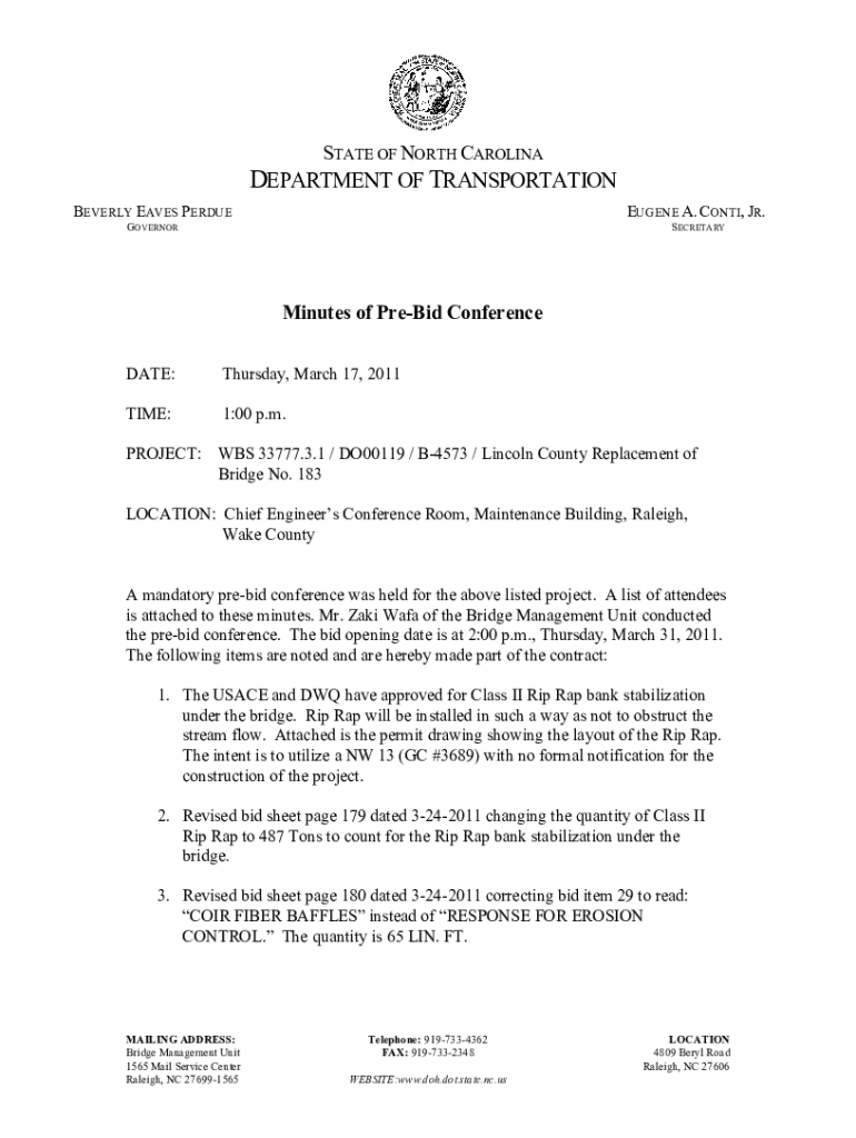 BEVERLY EAVES PERDUEEUGENE A. CONT, JR.GOVERNORSECRETARYMinutes of PreBid Conference