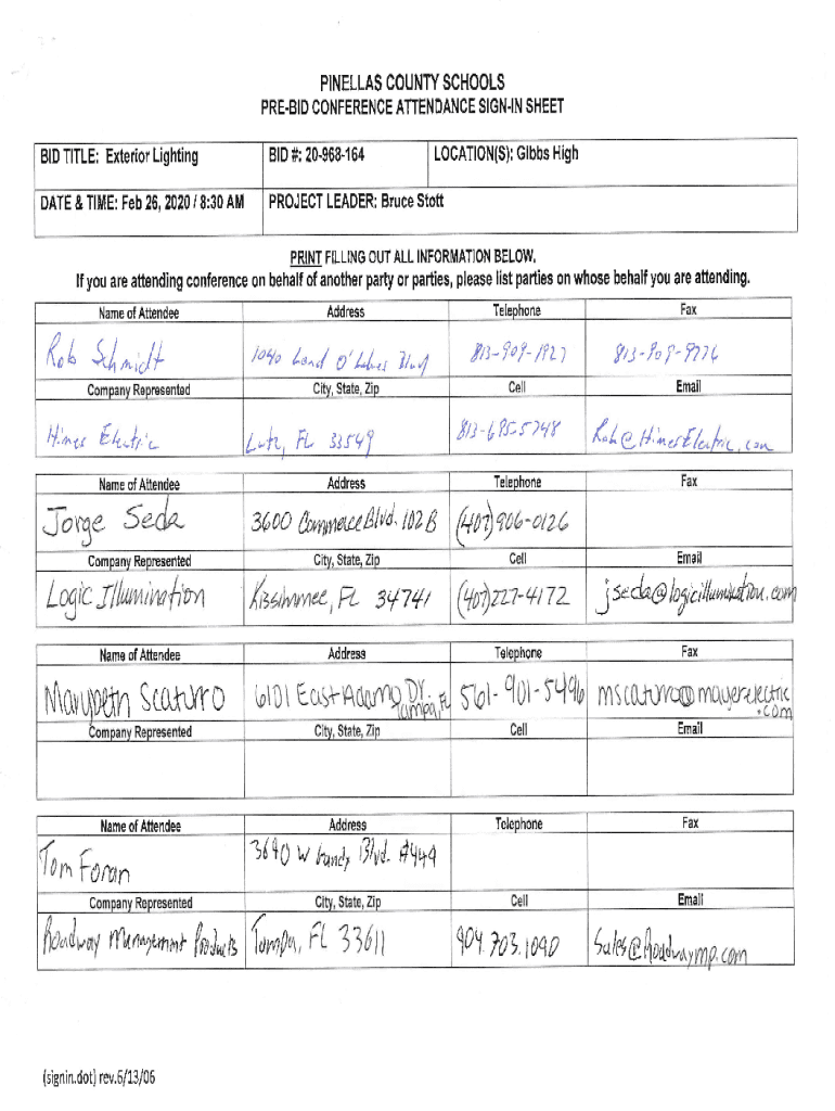 PINELLAS COUNTY SCHOOLS PREBID CONFERENCE ATTENDANCE SIGNING SHEET LOCATION(S): Gibbs High BID TITLE: Exterior Lighting BID#: 20968164DATE & TIME: Feb 26, 2020 / 8:30 PROJECT LEADER: Bruce Stott PRINT