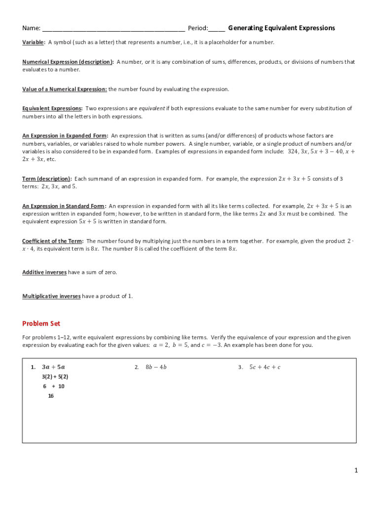 Get the free Name: Period: Generating Equivalent Expressions