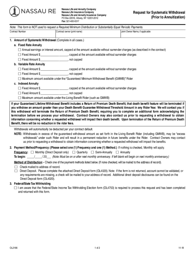 Nassau Life and Annuity Company Nassau Life Insurance Company Nassau Life and Annuity Insurance Company PO Box 22012, Albany, NY 122012012 Fax: 3214006317Request for Systematic Withdrawal (Prior to