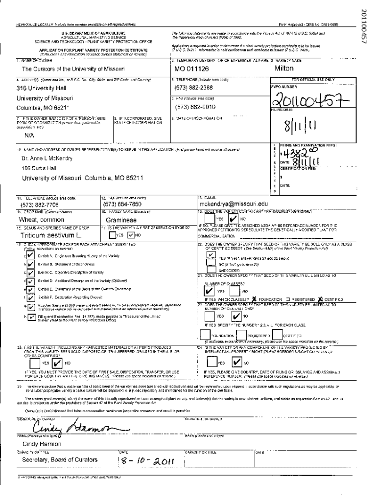 Form Approved OMB No. U.S. DEPARTMENT OF AGRICULTURE AGRICULTURAL MARKETING SERVICE SCIENCE AND TECHNOLOGY PLANT VARIETY Protection following statements are made in accordance the Paperwork Reduction
