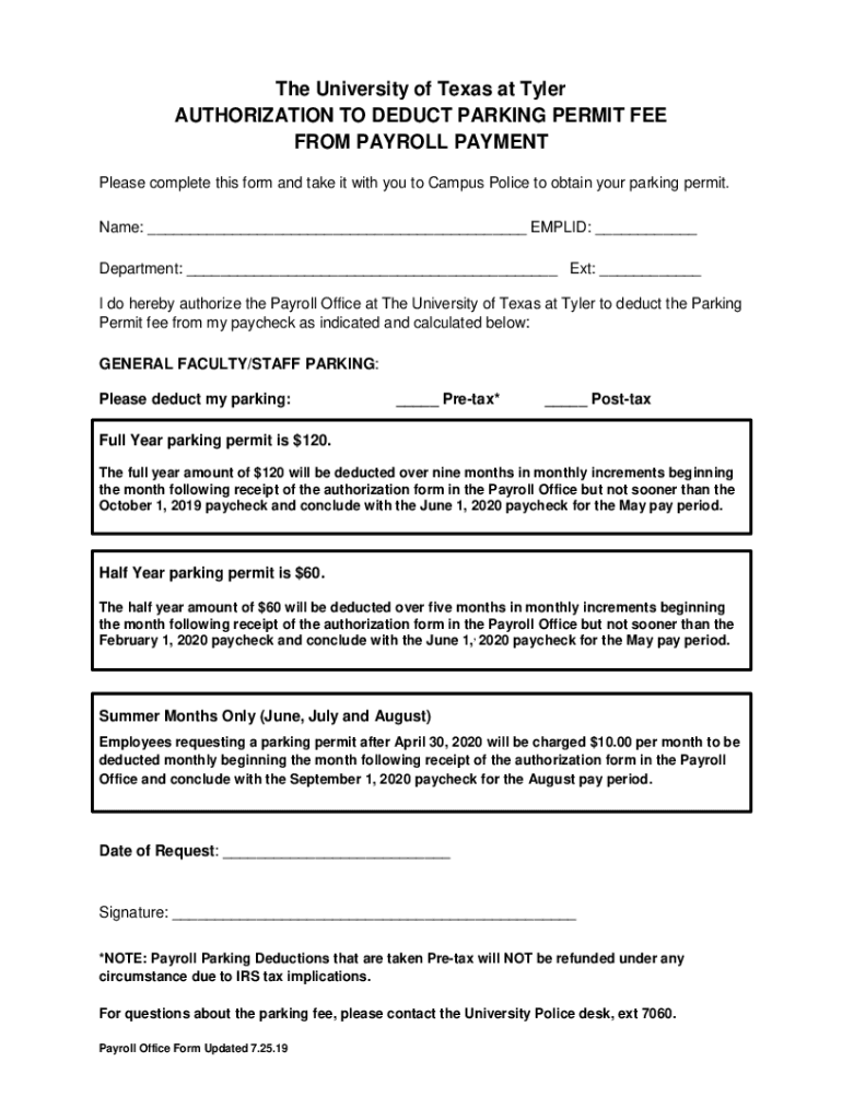 The University of Texas at Tyler AUTHORIZATION TO DEDUCT PARKING PERMIT FEE FROM PAYROLL PAYMENT Please complete this form and take it with you to Campus Police to obtain your parking permit. Name: