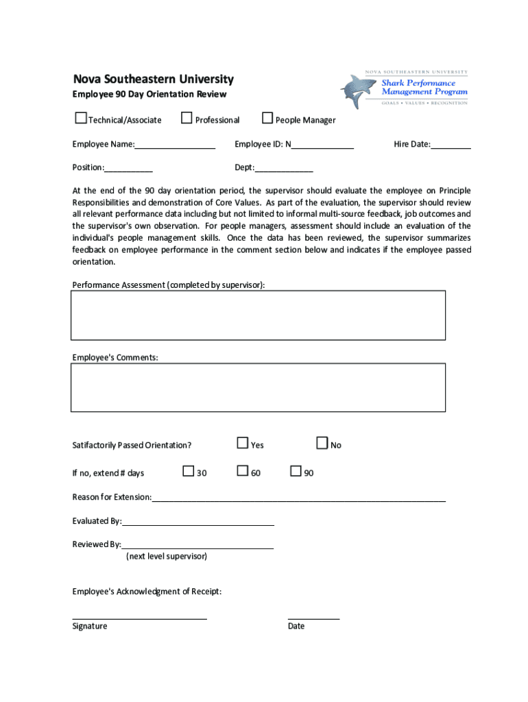 NovaSoutheasternUniversity Employee90DayOrientationReviewpTechnical/AssociatepProfessionalpPeopleManagerEmployeeName: Employee ID:N Position: Dept: Hire Date: At the end of the 90-day orientation