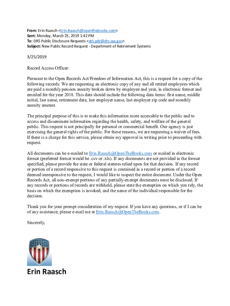 From: Erin Reach Erin. Reach openthebooks.com Sent: Monday, March 25, 2019 1:42 PM To: DRS Public Disclosure Requests DRS. Dr DRS.Wei.gov Subject: New Public Record Request Department of Retirement