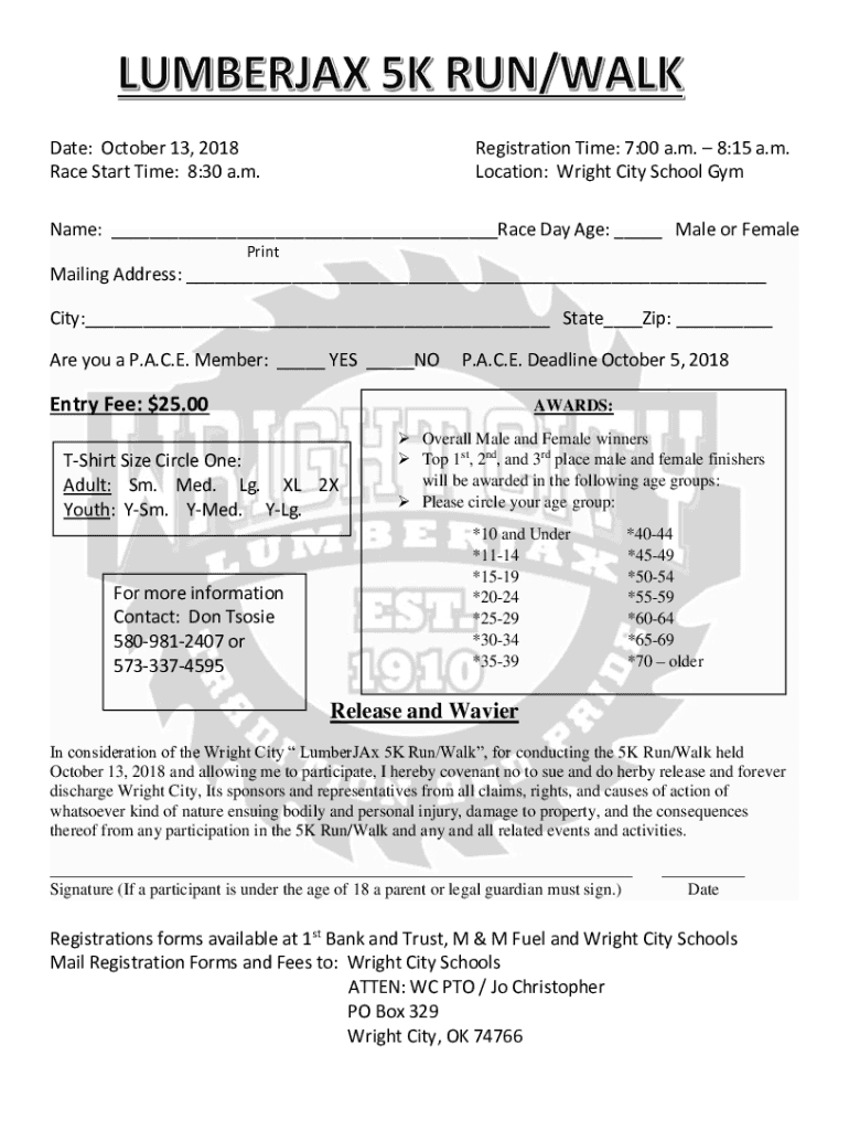 Date: October 13, 2018, Race Start Time: 8:30 a.m. Registration Time: 7:00 a.m. 8:15 a.m. Location: Wright City School Gymnast: Race Day Age: Male or Female Printmaking Address: City: State Zip: Are