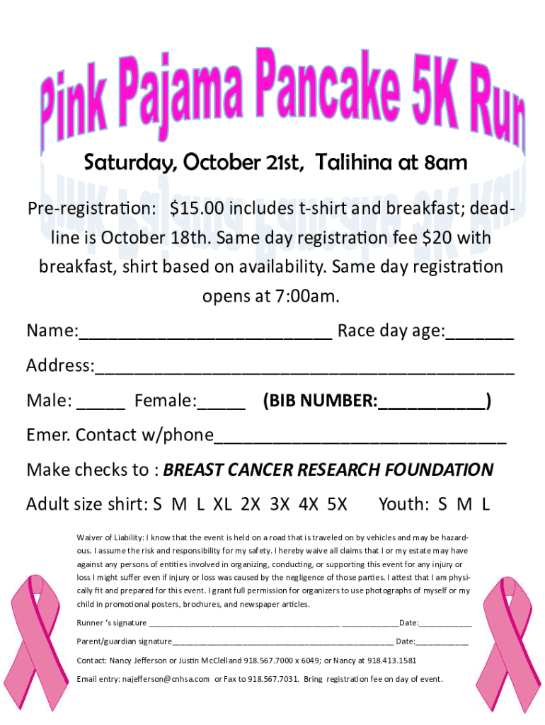Saturday, October 21st, Talking at 8am Preregister on: $15.00 includes shirt and breakfast; deadline is October 18th. Same day registry on fee $20 with breakfast, shirt based on availability. Same
