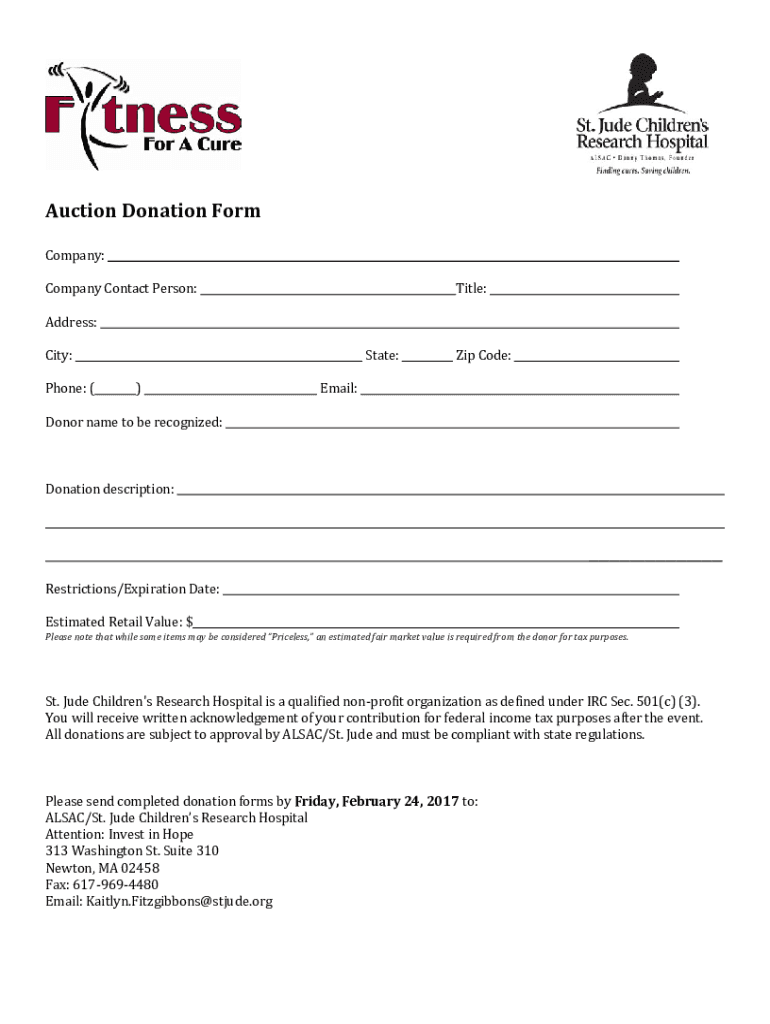 Get the free St Jude Fitness for a Cure auction form. Auction Form