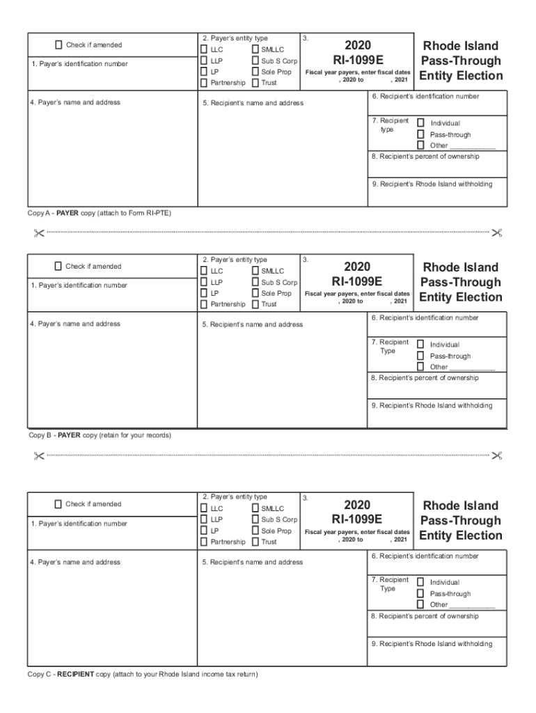 Check if amended 1. Payers identification number4. Payers name and address3.2. Payers entity type LLCSMLLCLLPSub S Corpuscle PropPartnershipTrust2020 RI1099EFiscal year payers, enter fiscal dates,