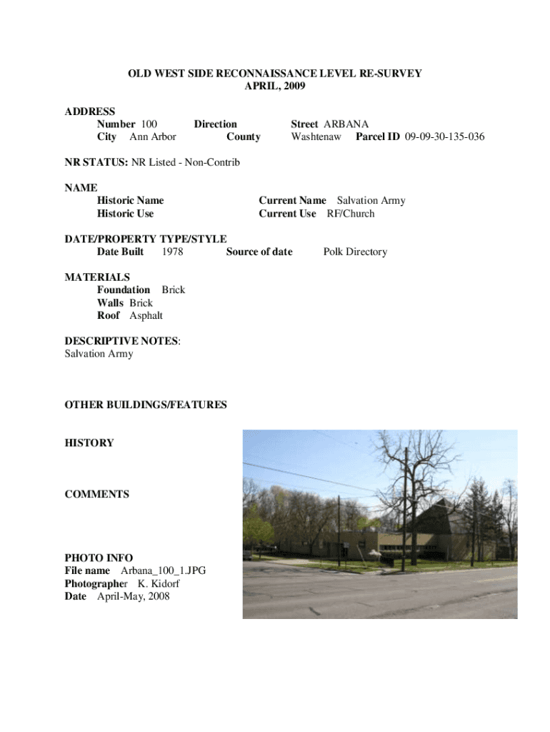 OLD WEST SIDE RECONNAISSANCE LEVEL RESURVEY APRIL 2009 ADDRESS Number 100 City Ann ArborDirection CountyStreet ARIANA Washtenaw Parcel ID 090930135036NR STATUS: NR Listed Concentric NAME Historic