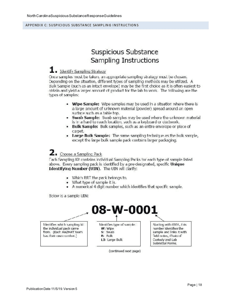North Carolina Suspicious Substance Response Guidelines APPENDIX C: SUSPICIOUS SUBSTANCE SAMPLING INSTRUCTIONSPublication Date 11/5/19. Version 5Page 18North Carolina Suspicious Substance Response