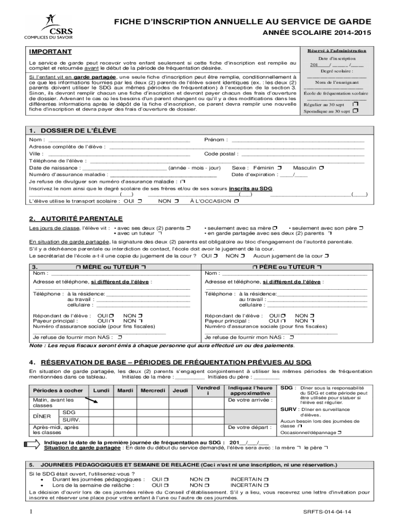 Obtenir le gratuit FICHE DINSCRIPTION ANNUELLE AU SERVICE DE GARDE
