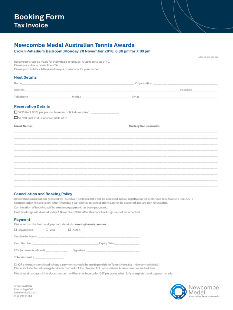 Booking Form Tax Invoice Newcomb Medal Australian Tennis Awards Crown Palladium Ballroom, Monday 28 November 2016, 6:30 pm for 7:00 pm ABN: 61 006 281 126Reservations can be made for individuals or