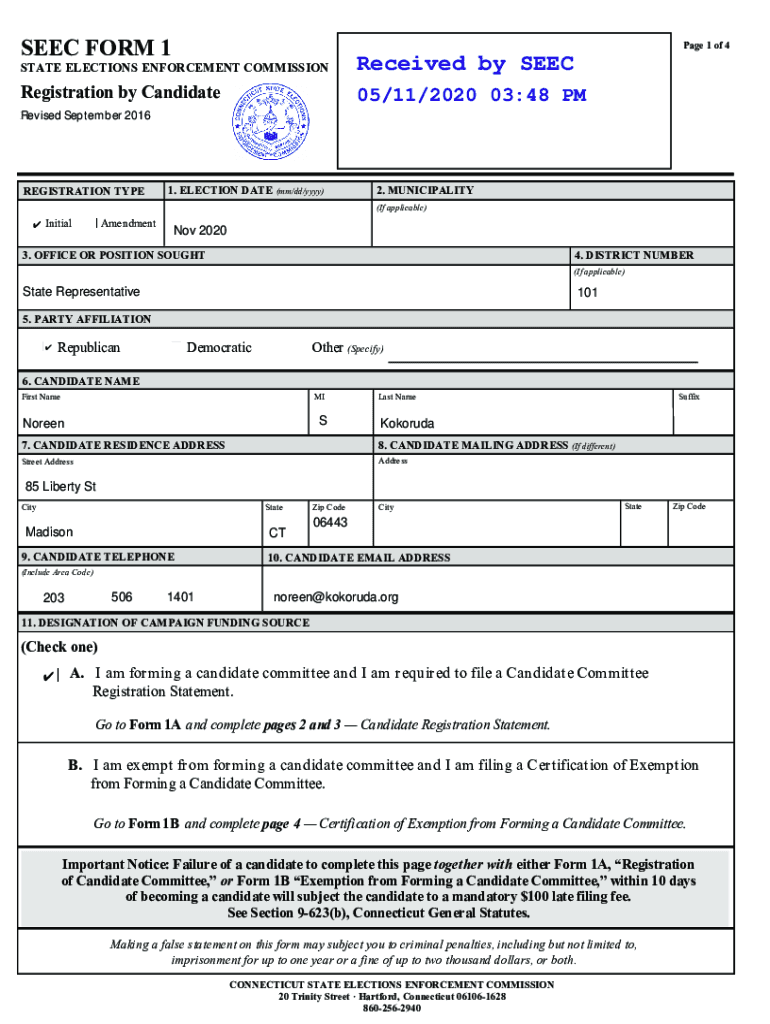 SEE FORM 1Updated 04/22/2016 with AM suggestionsSTATE ELECTIONS ENFORCEMENT COMMISSIONReceived by Preregistration by Candidate05/11/2020 03:48 PM Page 1 of 4RevisedJuly