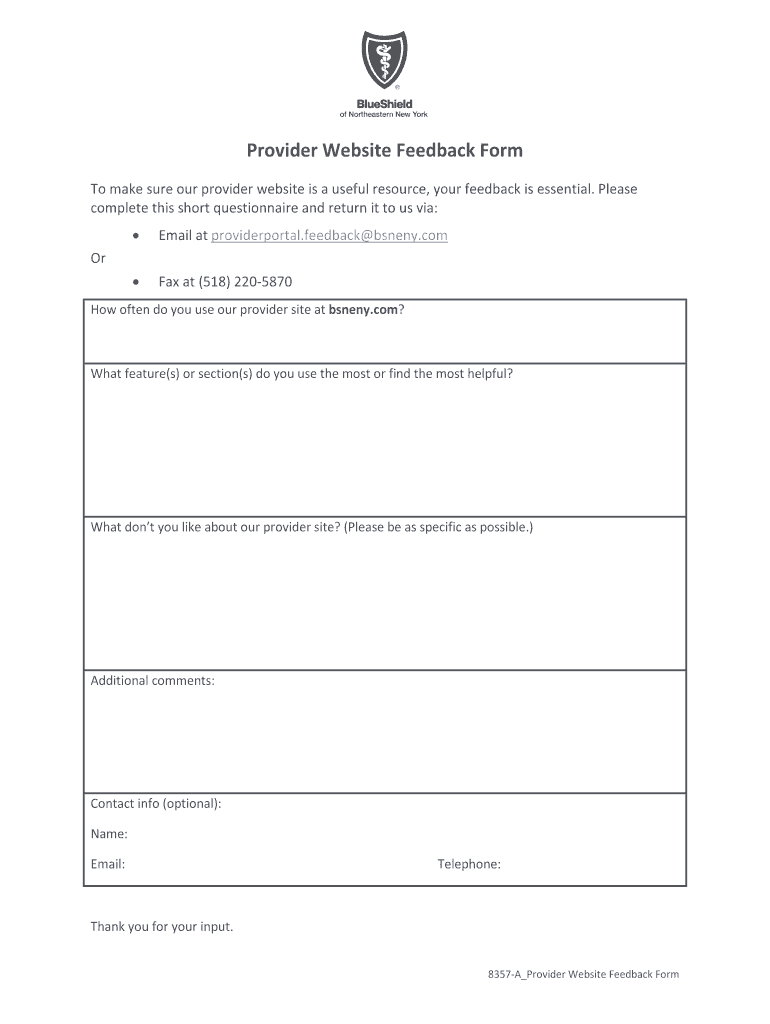 Anyone who has used the provider website at bsneny.com is eligible to fill out the Provider Website Feedback Form. This includes healthcare providers and general site users.