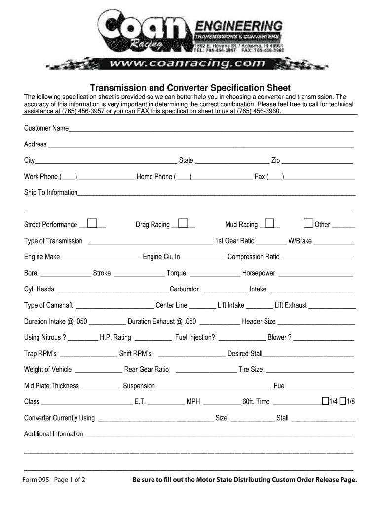 Transmission and Converter Specification Sheet The following specification sheet is provided, so we can better help you in choosing a converter and transmission. The accuracy of this information is