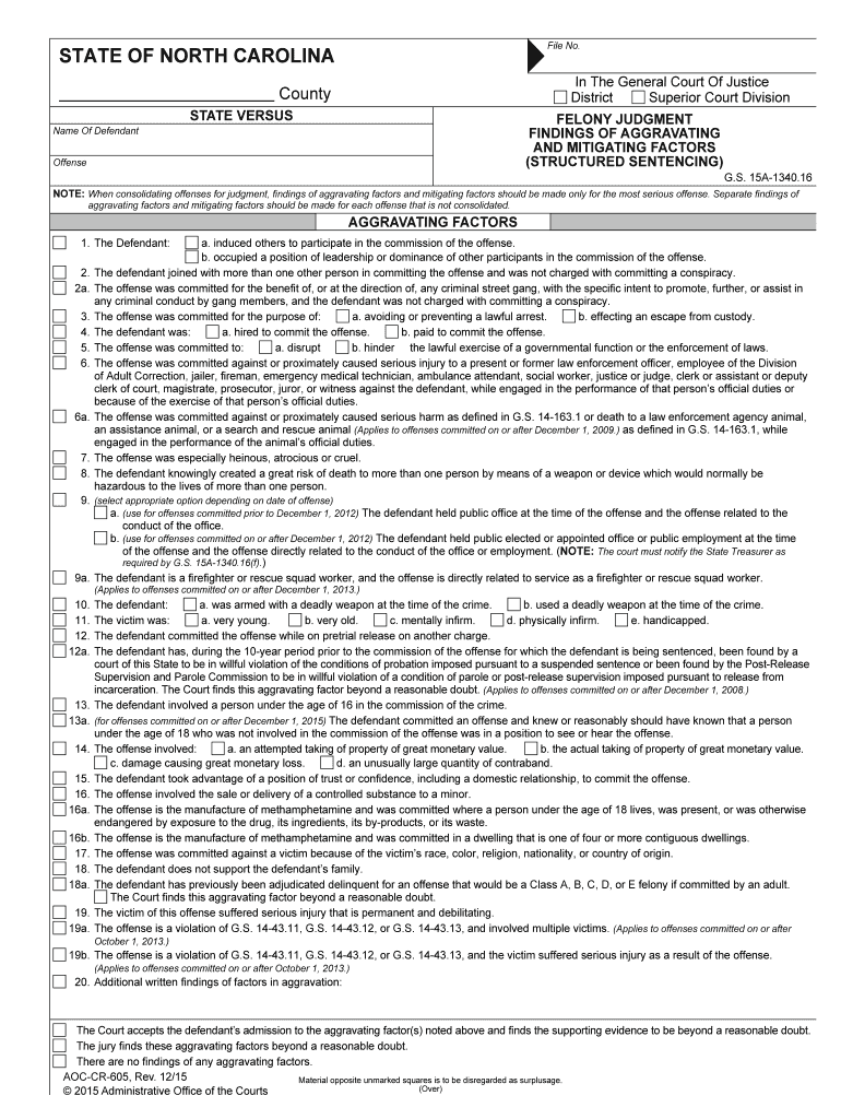 File No. STATE OF NORTH CAROLINA In The General Court Of Justice District Superior Court Division County Name Of Defendant STATE VERSUS FELONY JUDGMENT FINDINGS OF AGGRAVATING AND MITIGATING FACTORS