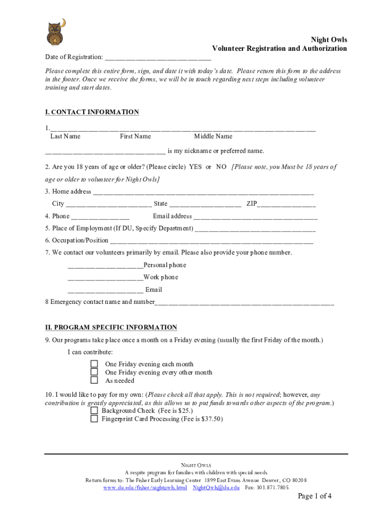 Night Owls Volunteer Registration and Authorization Date of Registration: Please complete this entire form, sign, and date it with today's date. Please return this form to the address in the footer.