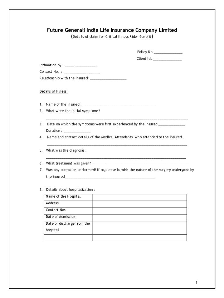 Future Generali India Life Insurance Company Limited (Details of claim for Critical Illness Rider Benefit) Policy No. Client I'd. Intimation by: Contact No. Relationship with the insured: Details